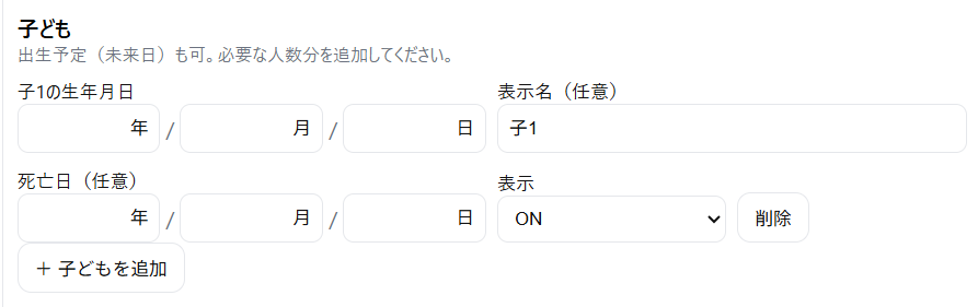 - 「+ 子どもを追加」ボタンで人数を増やせます。