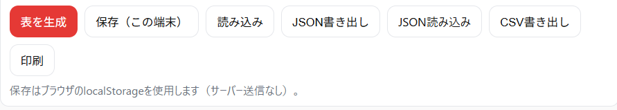 | ✅ 保存・読み込み | ブラウザ内(localStorage)に保存できるため、再入力不要 |